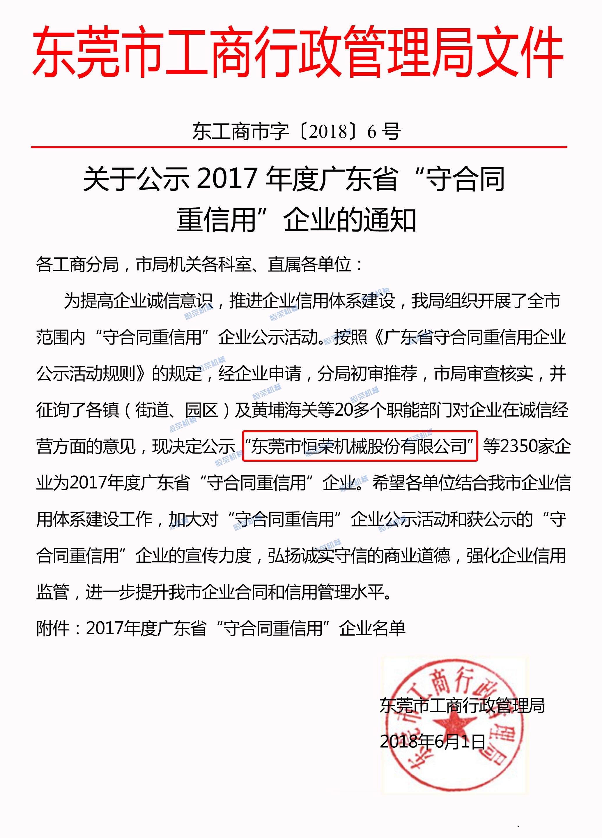 榮獲2017年度東莞市“守合同重信用”企業(yè)稱號(hào),表明了公司誠(chéng)信建設(shè)得到了政府主管部門和社會(huì)各界的高度認(rèn)可,彰顯了公司誠(chéng)信立企的核心價(jià)值觀,展示了公司重信用的良好形象。