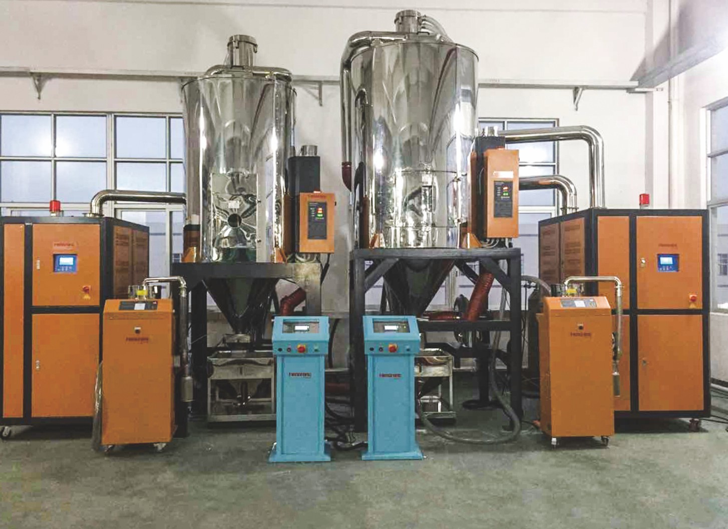 對于非吸濕性物料,可以使用熱風干燥機進行干燥。注塑機集中供料系統因為水分只是被物料與水的界面張力松散地約束,易于去除。此類機器的原理是,利用風扇來吸收環(huán)境中的空氣并將其加熱到干燥特定物料所要求的溫度,被加熱后的空氣經過干燥料斗,并通過對流的方式加熱物料以去除水分。